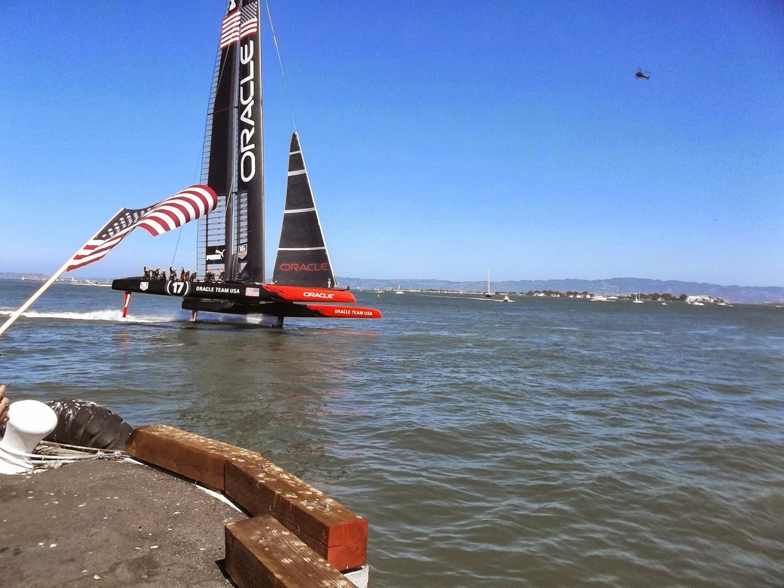 Esta semana ha sido activa. El miércoles fui a ver la copa américa, es espectacular ver esos dos barcos adelantando a barcas a motor. Da la impresión que se deslizan sobre el agua, como si fuera hielo. Me pude poner en línea de meta, justo donde daban la vuelta al terminar la carrera, así que los vi de cerca.